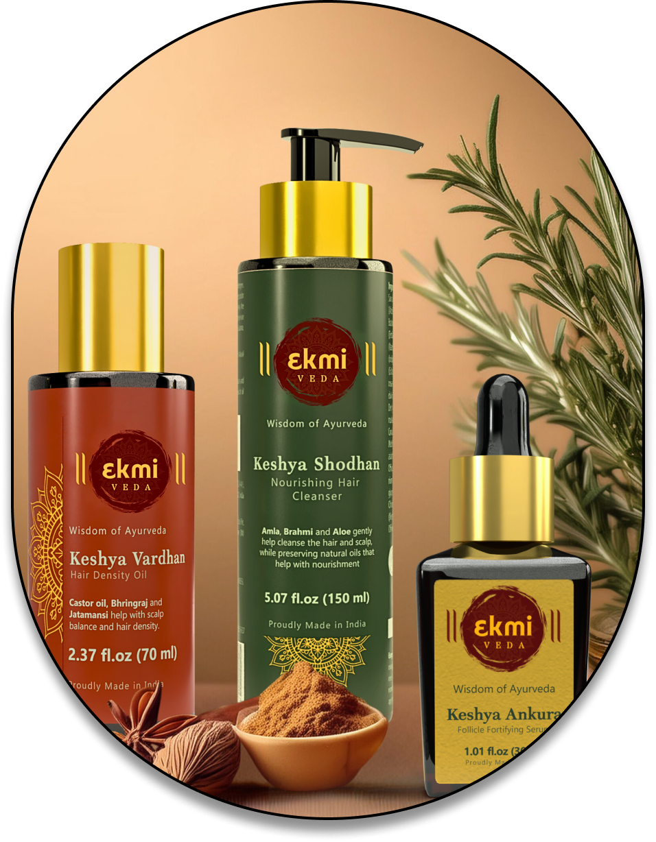 Together, Ekmiveda embodies our commitment to bringing you one complete solution for your hair health, rooted in science, Ayurveda, and personalized care.